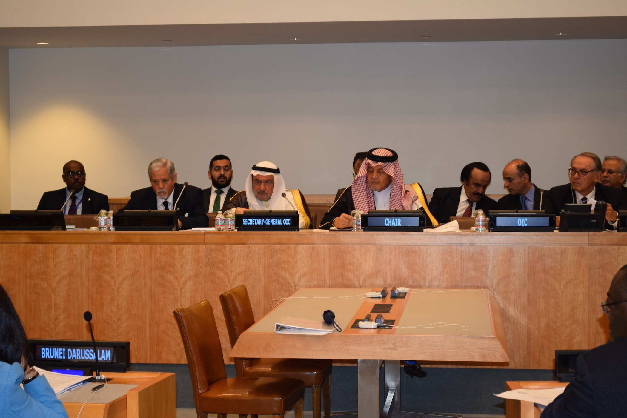 HRH Prince Saud Al-Faisal, Minister of Foreign Affairs of Saudi Arabia and Chairman of the current session of the Council of Foreign Ministers of the Member States of the Organization of Islamic Cooperation, opened the Annual Coordination Meeting of the OIC Foreign Ministers on Friday, 26 September 26 2014, in New York on the sidelines of the 69th Session of the United Nations General Assembly. In his opening speech, Prince Saud al-Faisal addressed the Palestinian issue where he said that Israel’s rejection of international peace efforts and insistence on confiscating Palestinian lands, establishing settlements in the West Bank and the City of Jerusalem, and changing its geography and demography, obligates the international community to strongly interfer to stop Israeli aggressions and pressure it to resume the peace negotiations with the Palestinian Authority on the basis of international references and the Arab Peace Initiative. On the Syrian crisis, he stressed that the Syrian people have the right that we stand by them and defend their legitimate rights against the regime, which refused all international and regional efforts and calls to opt for peace, save the Syrian people from bloodshed and protect their honor and dignity. Prince Saud also approached the situation in Iraq, Yemen and the threat of terrorism; he also touched on the subject of Islamophobia and Muslim communities in non-OIC member states.